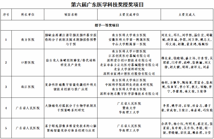 南方医院刘克玄教授牵头承担的《肠缺血再灌注诱导肠及肠外器官损伤的分子机制及围术期肠损伤预警与干预》、口腔医院邵龙泉教授牵头承担的《仿生化人体硬组织修复/替代材料研发及产业化》、珠江医院杨剑教授牵头承担的《复杂性肝癌数字智能化微创外科关键技术创新与推广应用》、广东省人民医院李勇教授牵头承担的《大肠癌化疗抵抗分子生物学机制及干预策略系列研究》、余洪华教授牵头承担的《基于眼底影像多维量化技术的心脑肾病智能化诊疗体系创建与应用》5个项目获广东医学科技奖一等奖。