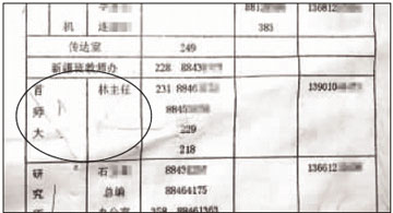 经证实,在首师大成教学院传达室的通讯录中,预备班负责人林代伦(画圈处)以首师大的某部门主任身份出现。